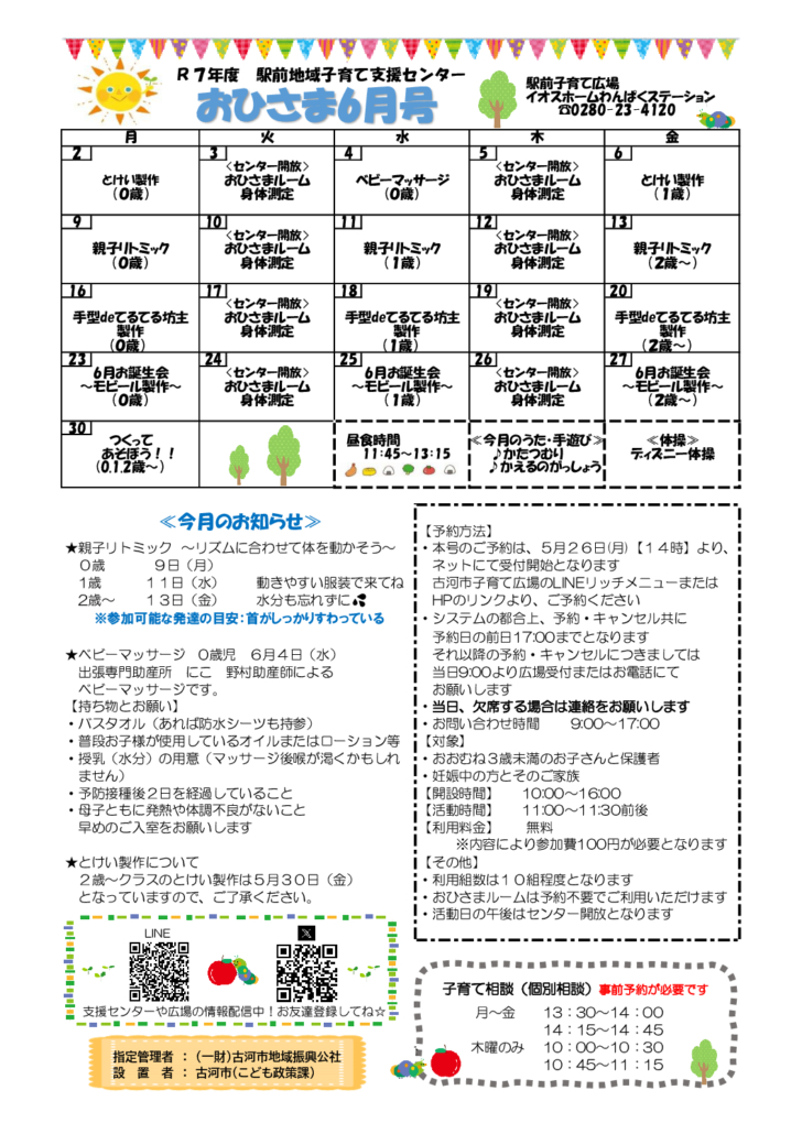 おひさま6月号 2025/5/30 https://koga-kousya.or.jp/koga-kodomokosodate/wp-content/uploads/2025/02/子育て広場ロゴ_new-1.svg 0 0 スタッフ https://koga-kousya.or.jp/koga-kodomokosodate/wp-content/uploads/2025/02/子育て広場ロゴ_new-1.svg スタッフ2025-05-30 17:12:072025-05-30 17:12:07おひさま6月号
