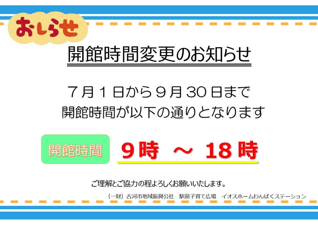 お知らせ開館時間変更(R7.7~) 2025/6/9 https://koga-kousya.or.jp/koga-kodomokosodate/wp-content/uploads/2025/02/子育て広場ロゴ_new-1.svg 0 0 スタッフ https://koga-kousya.or.jp/koga-kodomokosodate/wp-content/uploads/2025/02/子育て広場ロゴ_new-1.svg スタッフ2025-06-09 15:00:542025-06-09 15:00:54お知らせ開館時間変更(R7.7~)