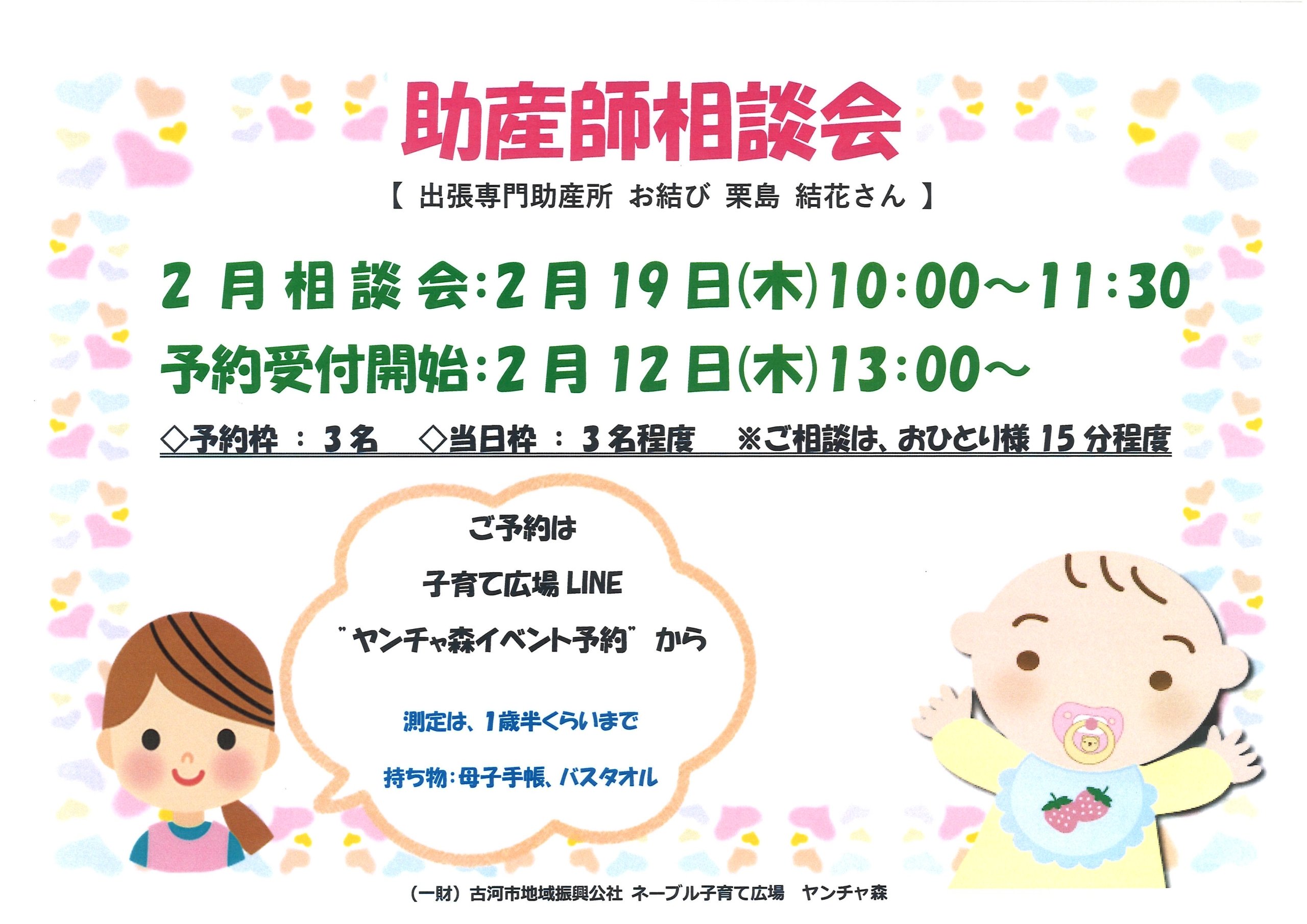 ネーブル子育て広場ネーブル子育て広場【助産師相談会】 日時:2月19日(木)10:00~11:30 出張専門助産所 お結び 栗島結花さんが来てくださいます。 ☆予約開始:2月12日(木)13:00~ ☆予約枠:3名(10:00~10:45) 当日枠:3名程度(10:45~11:30)※目安 ※おひとり様15分程度 ☆予約方法:子育て広場LINE ″ヤンチャ森イベント予約″から ☆身体測定をご希望の方は、母子手帳・バスタオルのご用意をお願いします。 子育ての気になること等、お気軽にご相談くださいね♪ 2026/1/16 https://koga-kousya.or.jp/koga-kodomokosodate/wp-content/uploads/2025/02/子育て広場ロゴ_new-1.svg 0 0 スタッフ https://koga-kousya.or.jp/koga-kodomokosodate/wp-content/uploads/2025/02/子育て広場ロゴ_new-1.svg スタッフ2026-01-16 10:00:132026-01-15 16:28:35ネーブル子育て広場【助産師相談会】