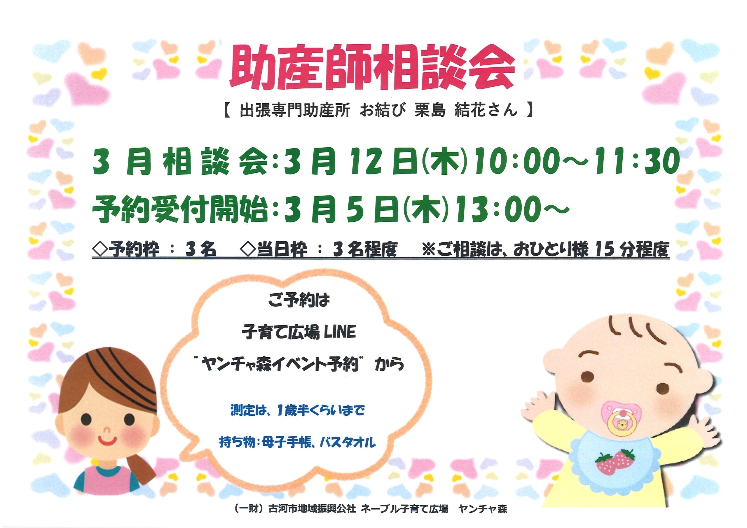 ネーブル子育て広場ネーブル子育て広場【助産師相談会】 日時:3月12日(木)10:00~11:30 出張専門助産所 お結び 栗島結花さんが来てくださいます。 ☆予約開始:3月5日(木)13:00~ ☆予約枠:3名(10:00~10:45) 当日枠:3名程度(10:45~11:30)※目安 ※おひとり様15分程度 ☆予約方法:子育て広場LINE ″ヤンチャ森イベント予約″から ☆身体測定をご希望の方は、母子手帳・バスタオルのご用意をお願いします。 子育ての気になること等、お気軽にご相談くださいね♪ 2026/2/19 https://koga-kousya.or.jp/koga-kodomokosodate/wp-content/uploads/2025/02/子育て広場ロゴ_new-1.svg 0 0 スタッフ https://koga-kousya.or.jp/koga-kodomokosodate/wp-content/uploads/2025/02/子育て広場ロゴ_new-1.svg スタッフ2026-02-19 13:00:132026-02-19 16:01:33ネーブル子育て広場【助産師相談会】