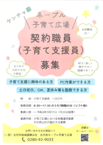 ネーブル子育て広場・契約職員募集POP 2025/6/6 https://koga-kousya.or.jp/koga-kodomokosodate/wp-content/uploads/2025/02/子育て広場ロゴ_new-1.svg 0 0 スタッフ https://koga-kousya.or.jp/koga-kodomokosodate/wp-content/uploads/2025/02/子育て広場ロゴ_new-1.svg スタッフ2025-06-06 09:59:012025-06-06 09:59:01ネーブル子育て広場・契約職員募集POP