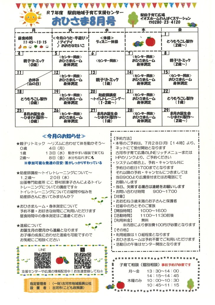 8月おひさま 2025/7/24 https://koga-kousya.or.jp/koga-kodomokosodate/wp-content/uploads/2025/02/子育て広場ロゴ_new-1.svg 0 0 スタッフ https://koga-kousya.or.jp/koga-kodomokosodate/wp-content/uploads/2025/02/子育て広場ロゴ_new-1.svg スタッフ2025-07-24 16:55:212025-07-24 16:55:218月おひさま