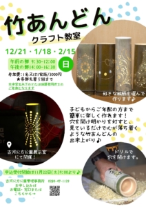 竹あんどん教室参加者募集2025/12/5/カテゴリ: お知らせ子どもからご年配の方まで簡単に楽しく作れます! 穴を開け明かりを灯すと、見ているだけで心が落ち着くような 竹あんどんの出来上がり♪ https://koga-kousya.or.jp/koga-park/wp-content/uploads/2025/02/logo_w500.png 0 0 koga-park https://koga-kousya.or.jp/koga-park/wp-content/uploads/2025/02/logo_w500.png koga-park2025-12-05 09:28:432025-12-05 09:32:46竹あんどん教室参加者募集