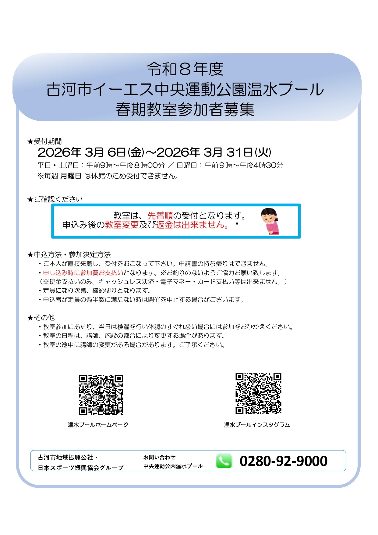 春期温水プール教室参加者募集のお知らせ【申込3月6日(金)~】【開催:2026年4月~】2026/2/26/カテゴリ: 温水プール, 総合案内 https://koga-kousya.or.jp/undokoen/wp-content/uploads/2025/02/header_logo_white-1-300x135.png 0 0 スタッフ https://koga-kousya.or.jp/undokoen/wp-content/uploads/2025/02/header_logo_white-1-300x135.png スタッフ2026-02-26 11:19:112026-02-26 11:19:11春期温水プール教室参加者募集のお知らせ【申込3月6日(金)~】【開催:2026年4月~】